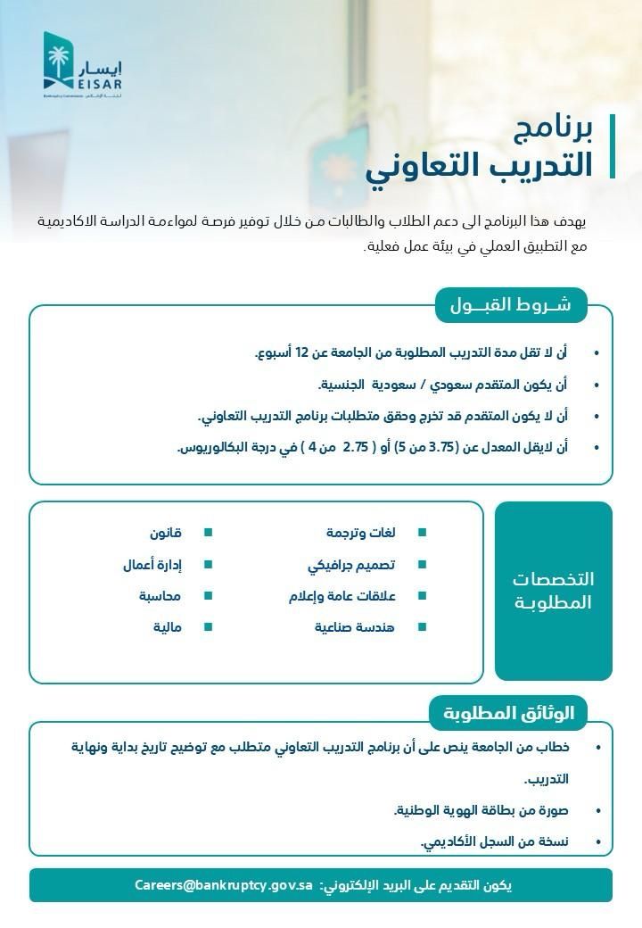 لجنة الإفلاس “إيسار” تعلن عن بدء التقديم في برنامج التدريب التعاوني للجنسين بالرياض