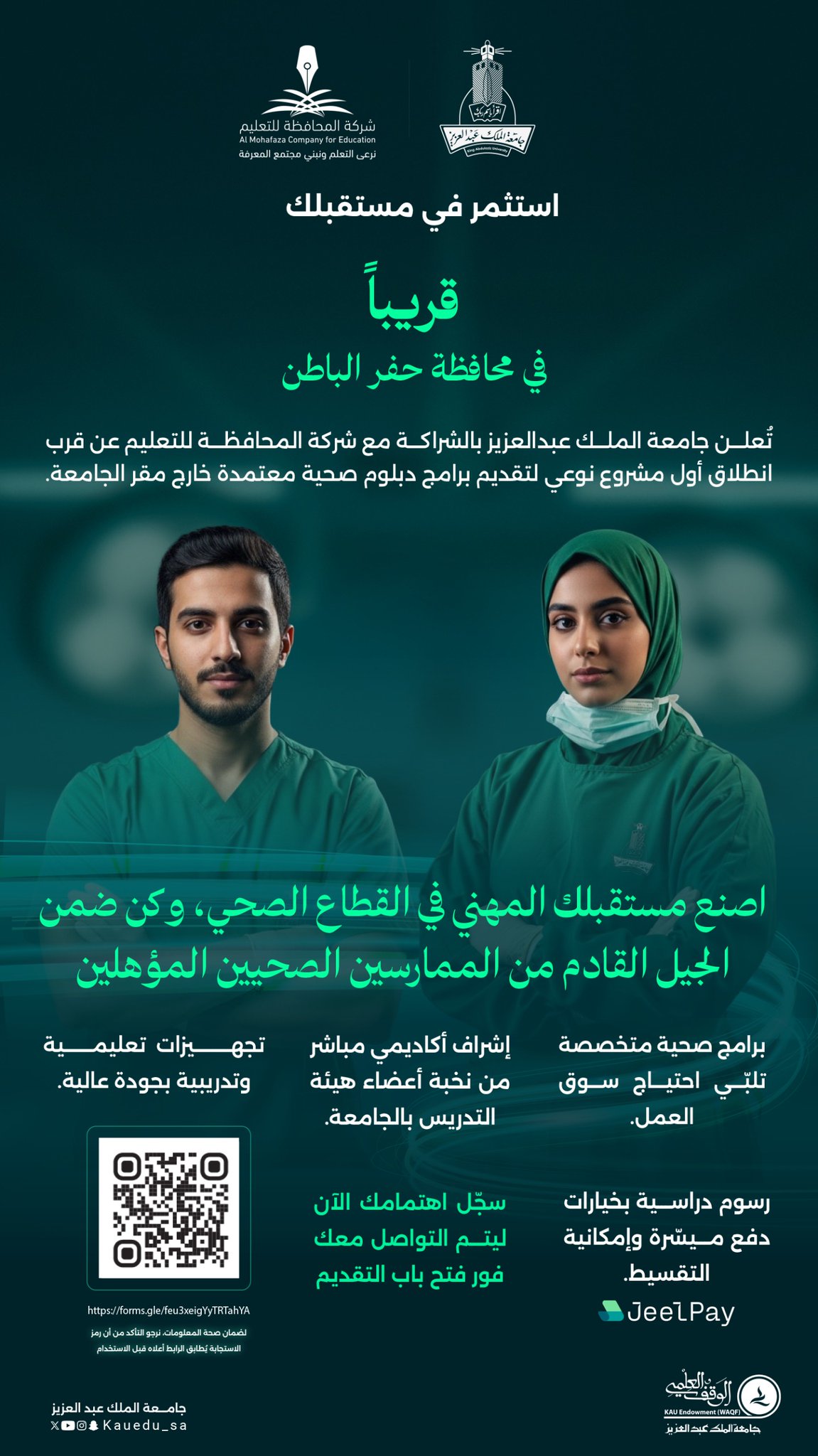 جامعة الملك عبدالعزيز تعلن قريباً برامج دبلوم صحية متخصصة بحفر الباطن