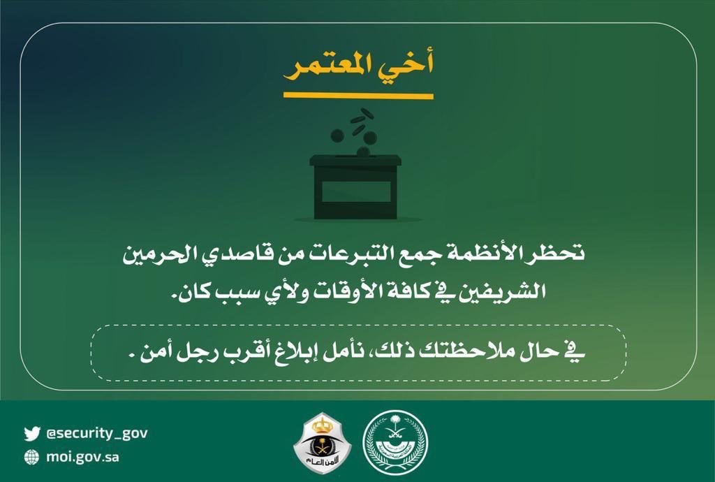 ” أخي المعتمر.. تحظر الأنظمة جمع التبرعات من قاصدي الحرمين الشريفين في كافة الأوقات ولأي سببٍ كان”.