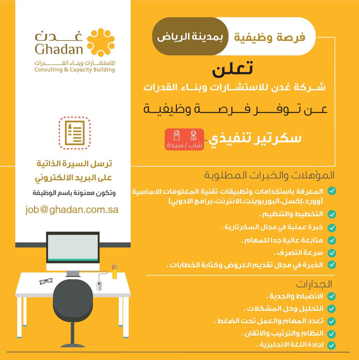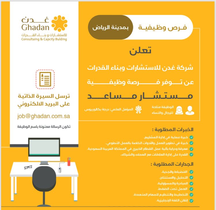 ارسال السيرة الذاتية إلى الإيميل التالي: job@ghadan.com.sa