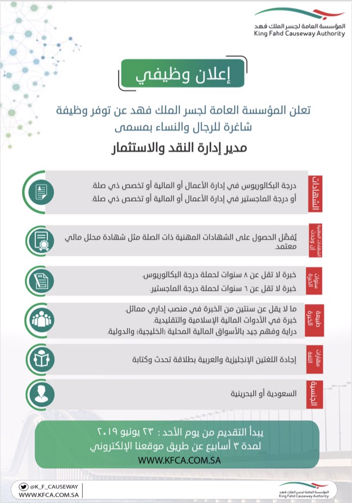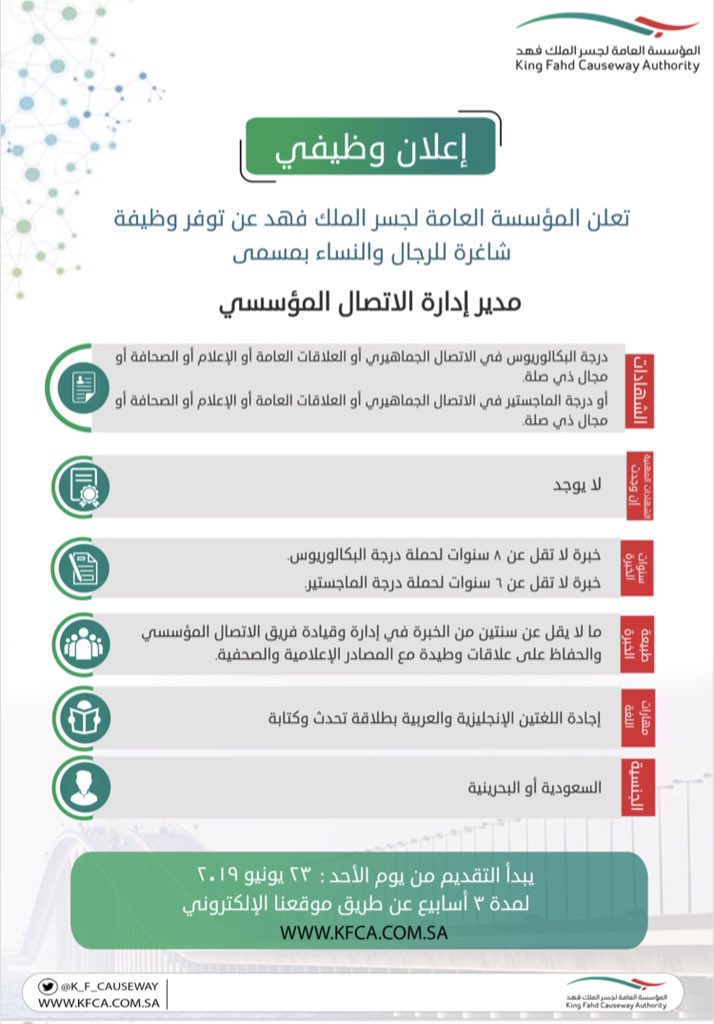الرئيسية/منوعات/وظائف/المؤسسة العامة لجسر الملك فهد تعلن عن توفر وظائف إدارية شاغرة للسعوديين والبحرينيين من الجنسين وظائف المؤسسة العامة لجسر الملك فهد تعلن عن توفر وظائف إدارية شاغرة للسعوديين والبحرينيين من الجنسين ياسمين23/06/2019 6٬131 أقل من دقيقة التقديم | من خلال الرابط التالي : اضغط هنا ياسمين23/06/2019 6٬131 أقل من دقيقة فيسبوك X لينكدإن Tumblr بينتيريست Reddit VKontakte مشاركة عبر البريد طباعة