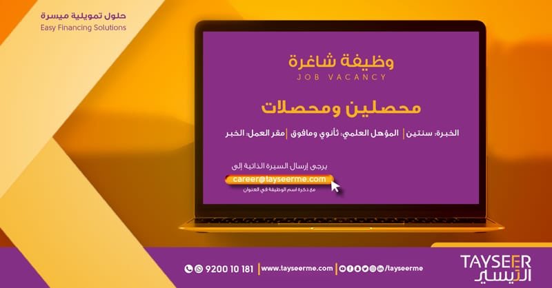 يرجى كتابة مسمى الوظيفة في عنوان البريد الإلكتروني يرجى إرسال السيرة إلى : career@tayseerme.com