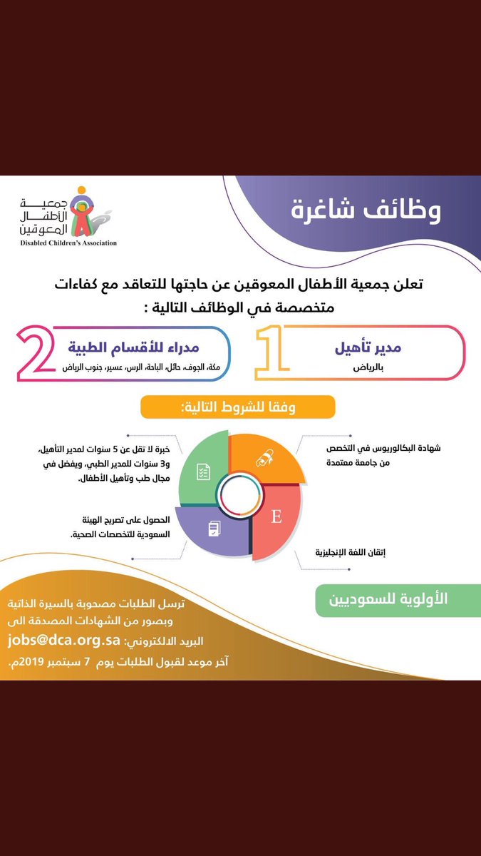 تعلن جمعية الأطفال المعوقين عن حاجتها للتعاقد مع كفاءات متخصصة في الوظائف البريد الالكتروني : jobs@dca.org.sa