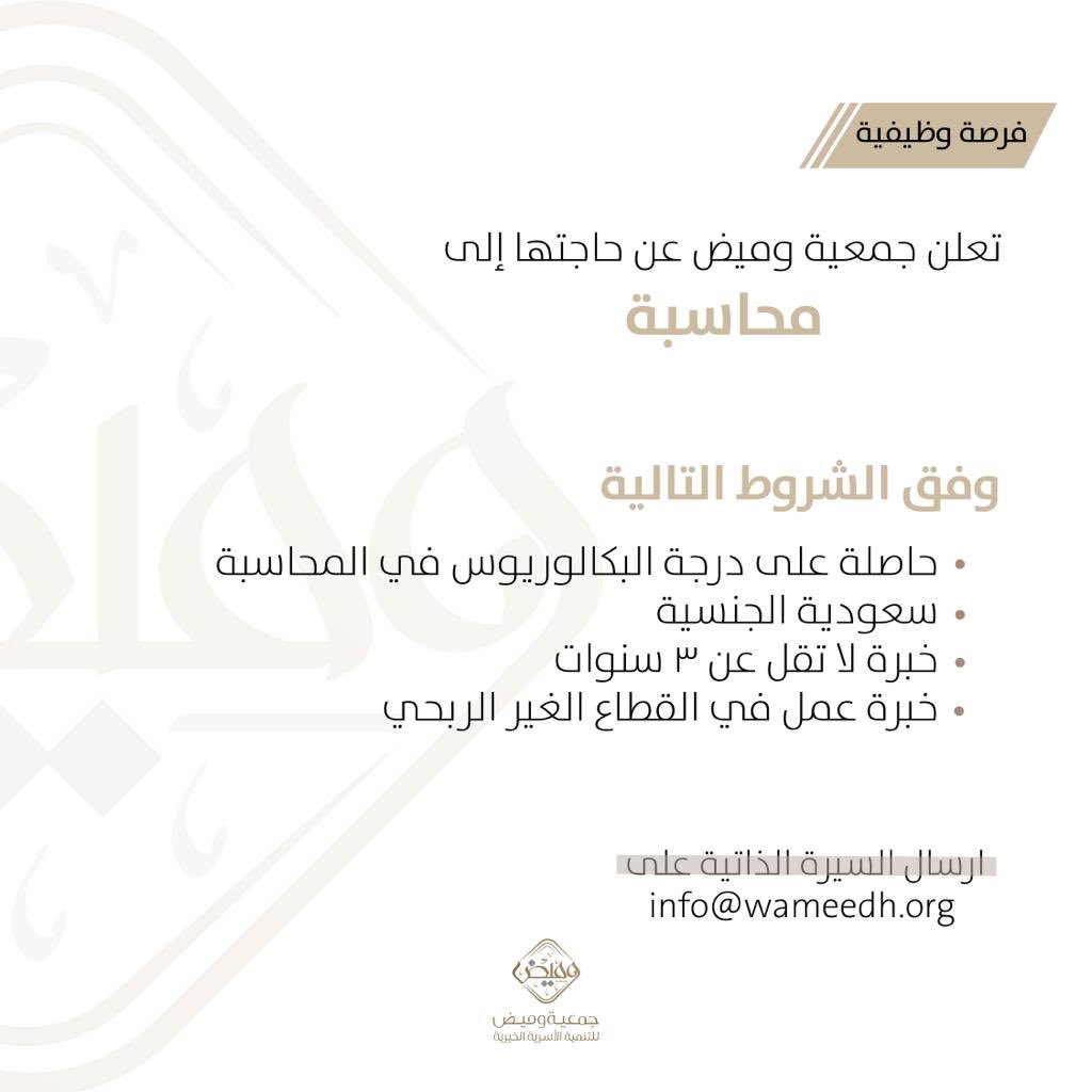 تعلن جمعية وميض للتنمية الاسرية عن حاجتها الى محاسبة للعمل بالمنطقة الشرقية يتم ارسال السيرة الذاتيه عن طريق ايميل الجمعية : Info@wameedh.org