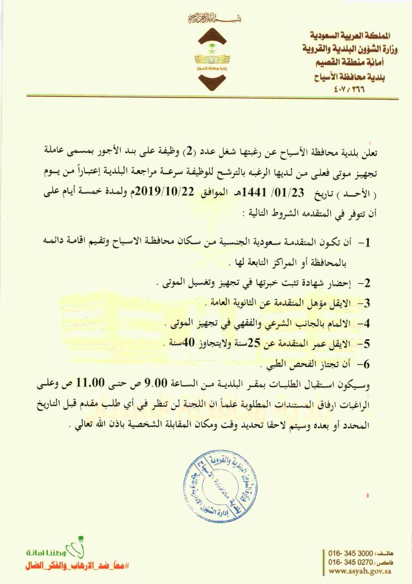 بلدية محافظة الأسياح تعلن عن رغبتها شغل عدد وظيفتين على بند الأجور أعتباراً من يوم الأحد ١٤٤١/٠١/٢٣هـ لمدة خمسة أيام