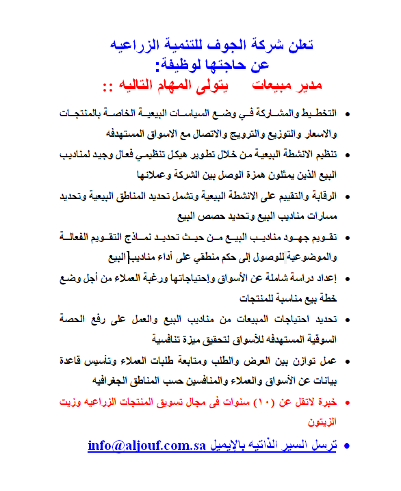 شركة الجوف للتنمية الزراعية تــوفر وظائف قيادية شاغرة لذوي الخبرة